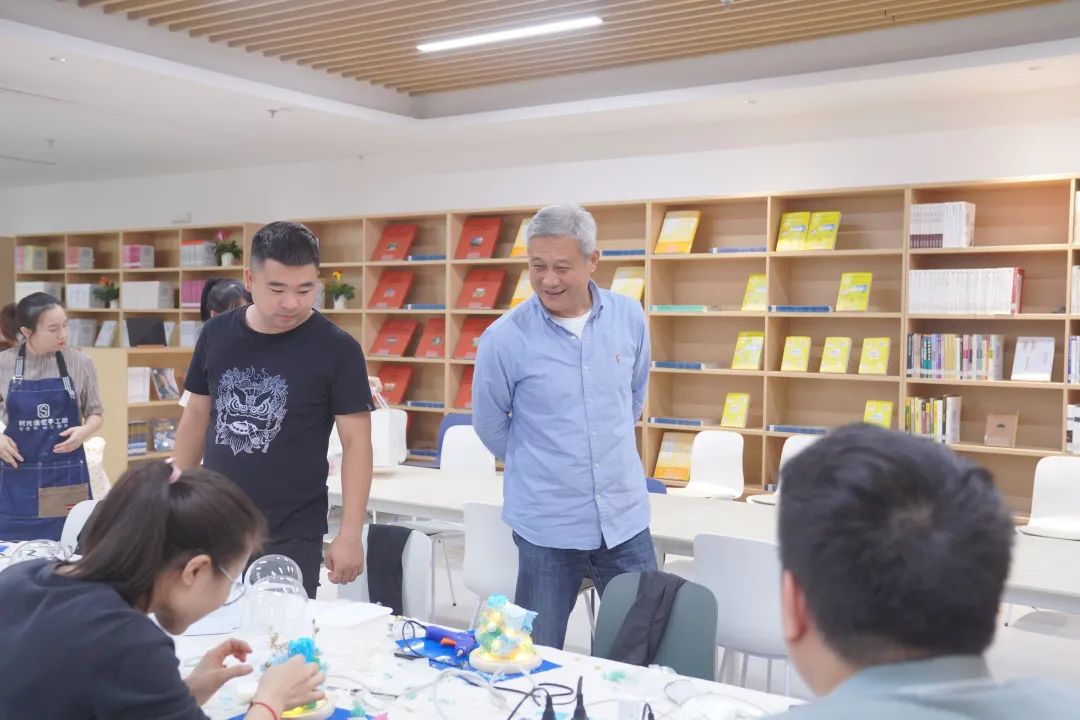 党支部书记、校长王占宝参与到活动中来,欣赏教师们的作品。