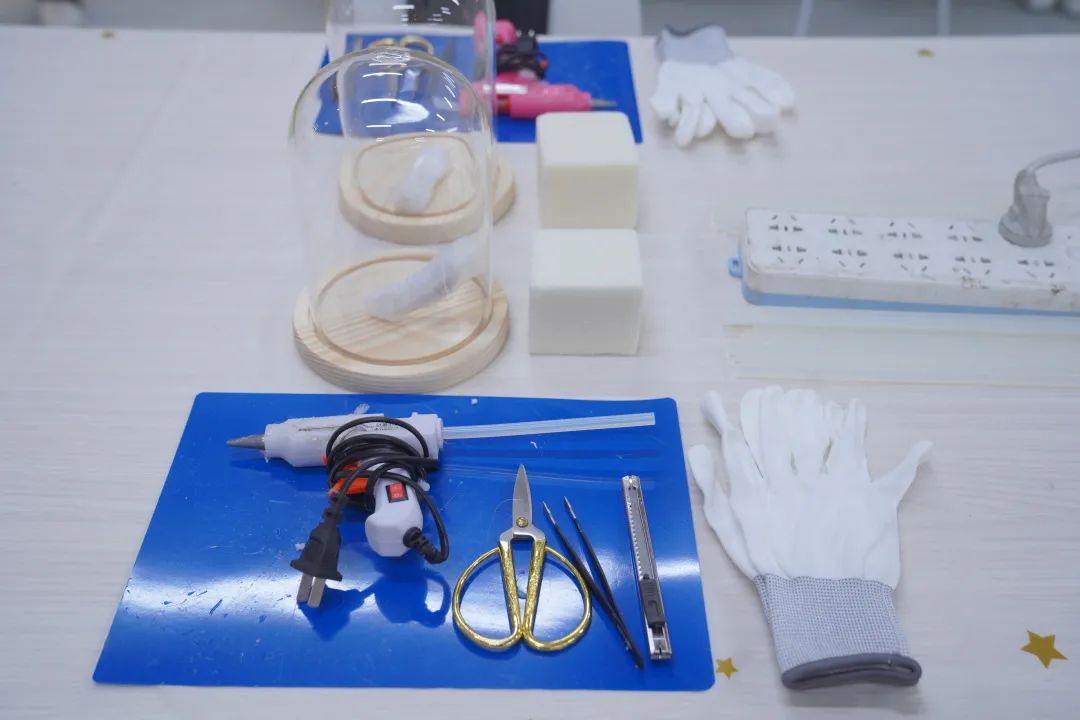 鲜花、剪刀、花泥、胶枪、镊子、玻璃罩…各种材料和工具整齐有序地摆放在成美馆,安静地等待着老师们的到来…