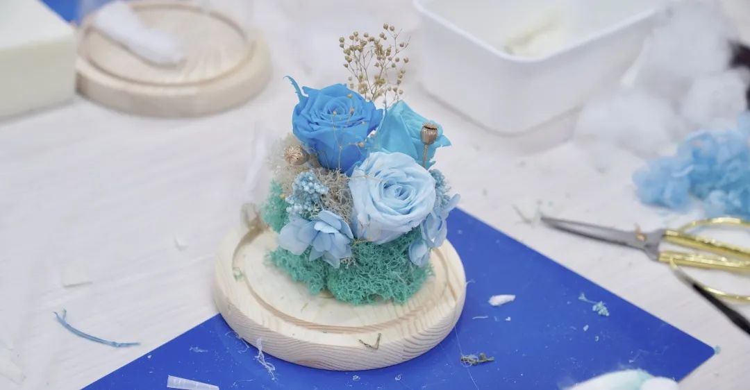 玫瑰花、小苔藓、绣球花、小金球、小灯带……在老师们的手里被注入了新的灵感和生命力。在经过扦插、修剪、造型、胶固等一系列工序之后,永生花作品大功告成,一起来欣赏一下老师们的作品吧!