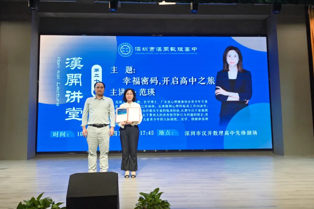 讲座现场气氛热烈,范博士的精彩分享,赢得现场师生阵阵掌声。深圳市汉开数理高中第一书记欧阳品林也代表学校,为范博士颁发收藏证书,将本次讲座以作品形式收藏于校史馆。