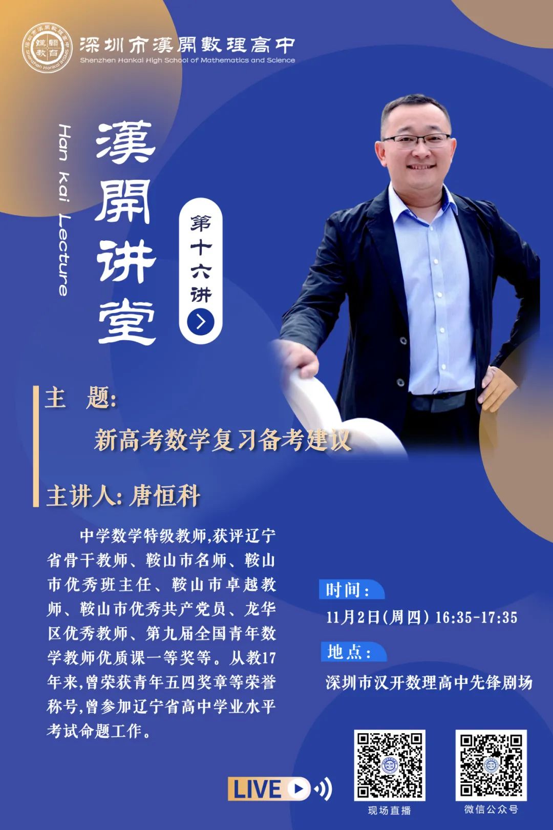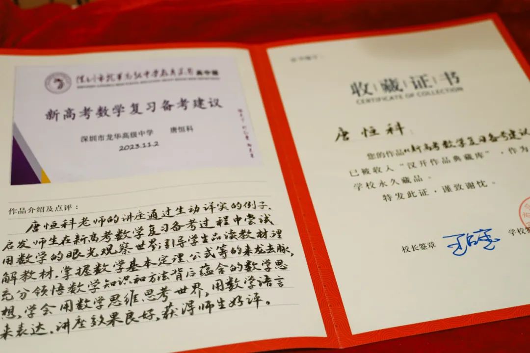 最后,校长助理沈宗春老师代表学校为唐老师颁发校史馆“收藏证书”,感谢唐老师为同学们带来精彩讲座。同时将唐老师的讲座内容,收入“汉开作品典藏库”,作为学校永久藏品。