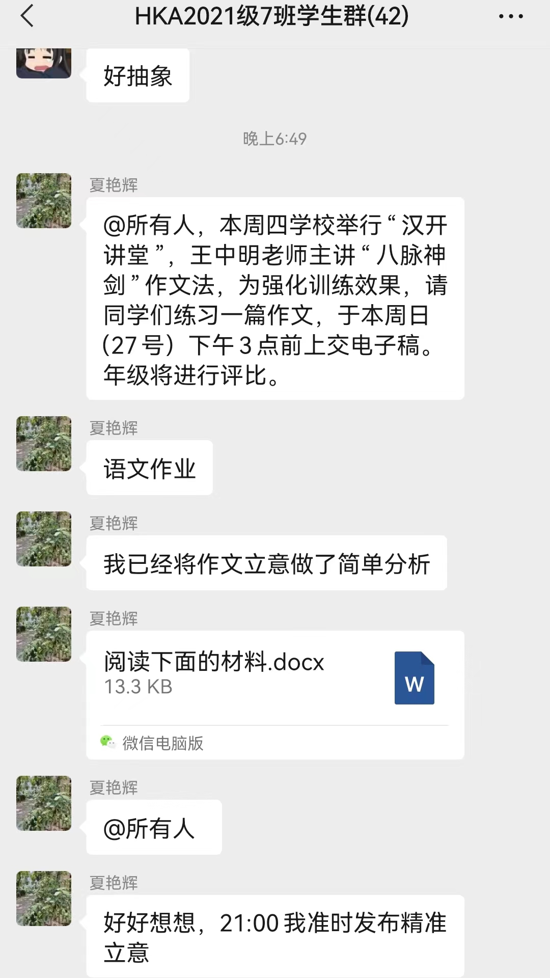 课后,高二年级每个语文老师随即模拟高考作文题目,布置作文练习,让学生用“八脉神剑法”进行写作练习,同时进行批改和点评,让学生真正能够学以致用。