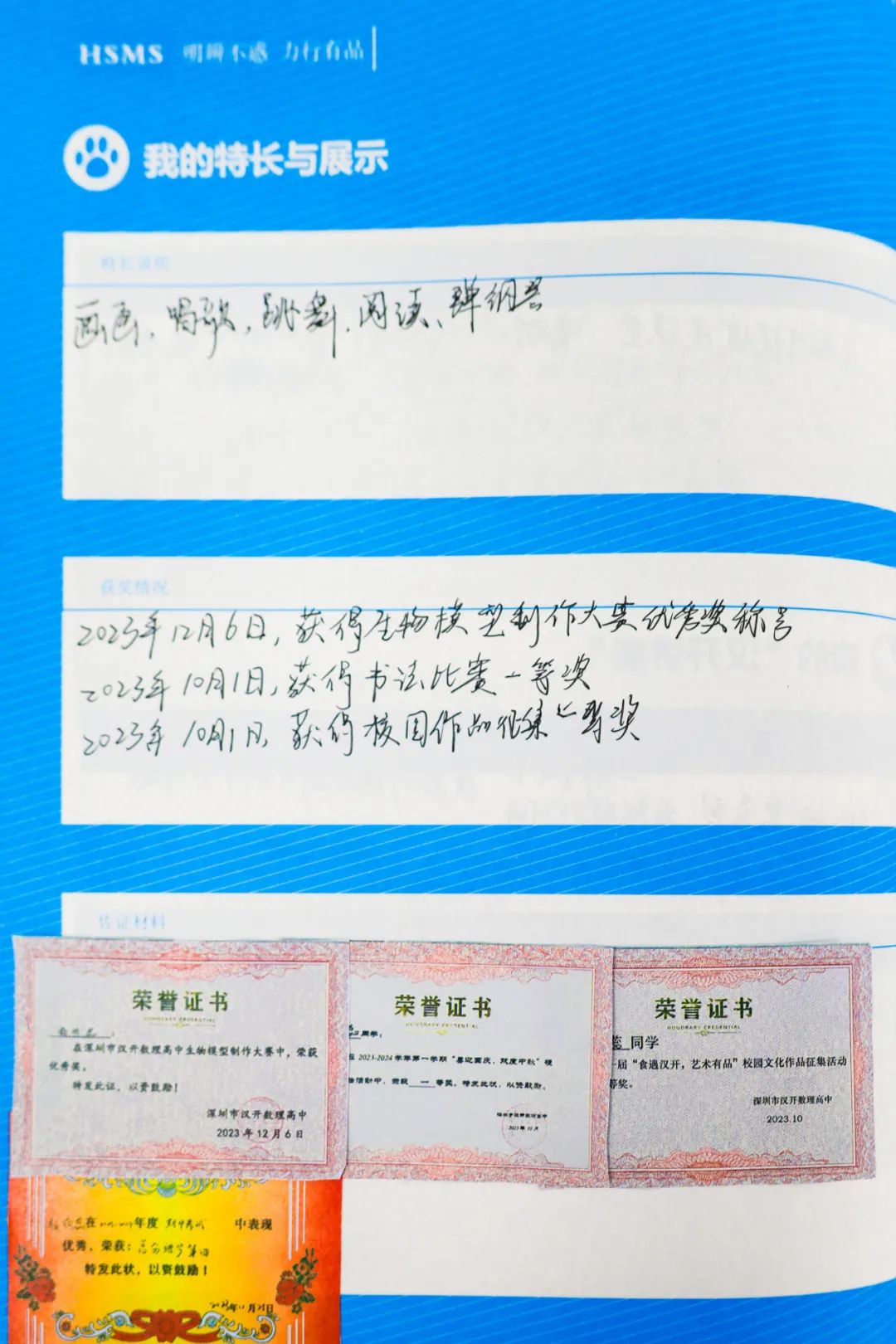 “足迹”,是学生在奋进时候留下的脚印。《我的漢開足迹》是汉开为学子设计的成长记录册:入学礼照片、我的良师、我的同学、我的“体质健康卡”、我的探究性学习、我的荣誉、我的漢開作品、我的假期实践……