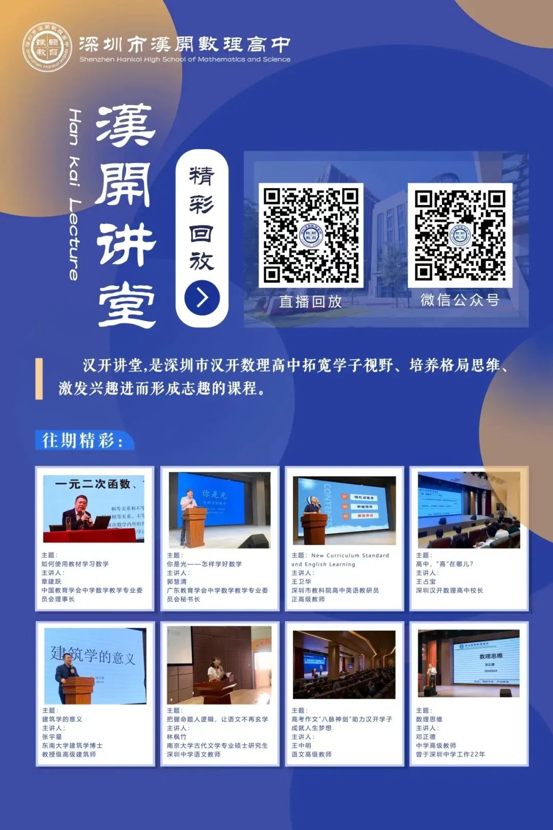 汉开讲堂,是深圳汉开数理高中拓宽学子视野、培养格局思维、激发兴趣进而形成志趣的课程。