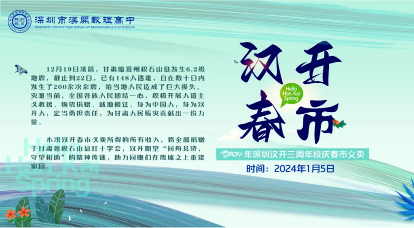 2024年1月5日,喜迎深圳市汉开数理高中三周年校庆,在校园中、运风场上呈现出第三届“汉开春市义卖”和“汉开春语义演”的精彩瞬间。