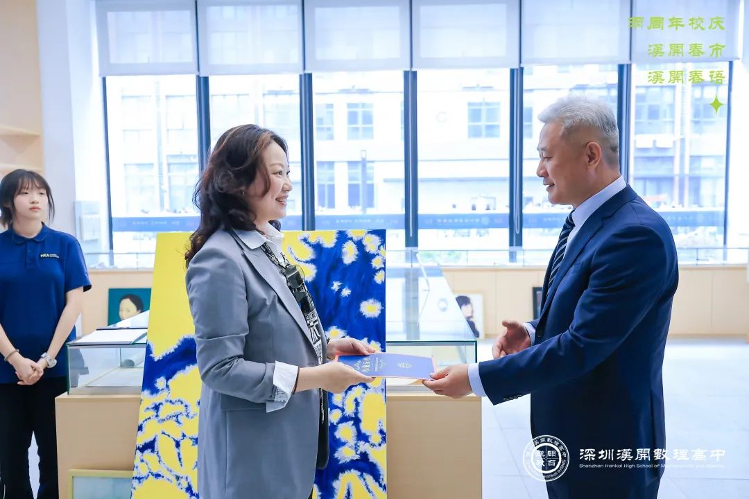 陈炜女士正在美国求学,委托母亲郑海华女士到校捐赠。王占宝校长向郑女士颁发收藏证书。