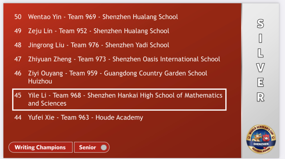 4月1日-2日,深圳汉开剑桥国际中心何丹Danae老师带领IG1谭恒毅Henry、IG2李怡乐Elliott、AS姚晶鹭Addie三位同学参加2023年世界学者杯(The World Scholar’s Cup)华南区区域赛。