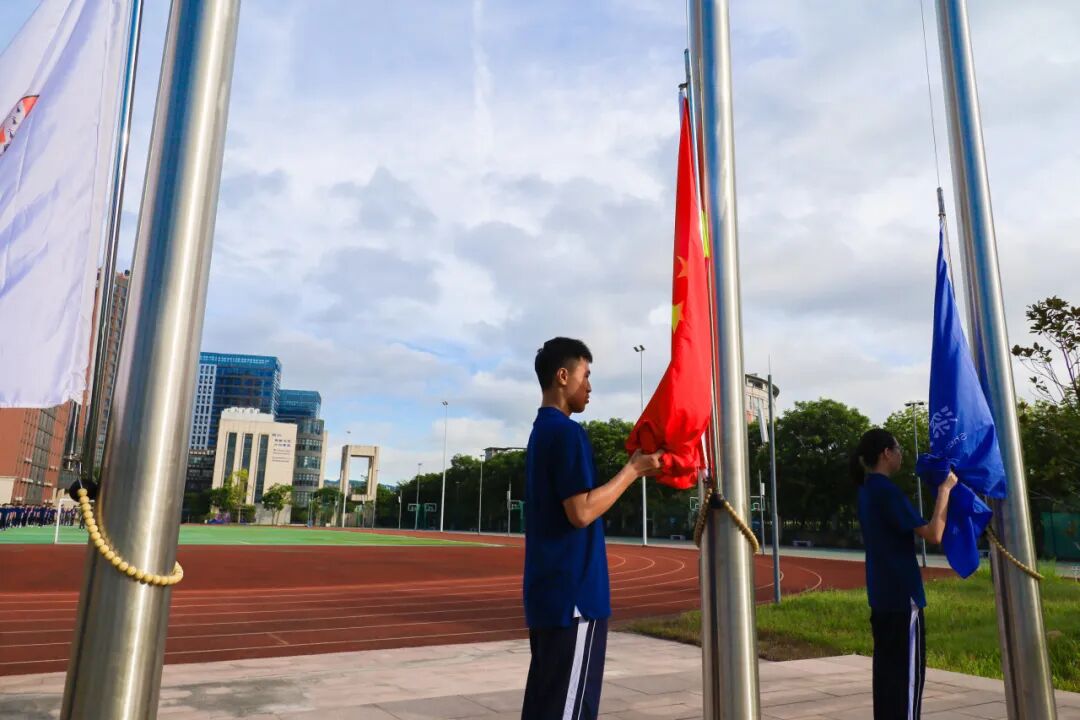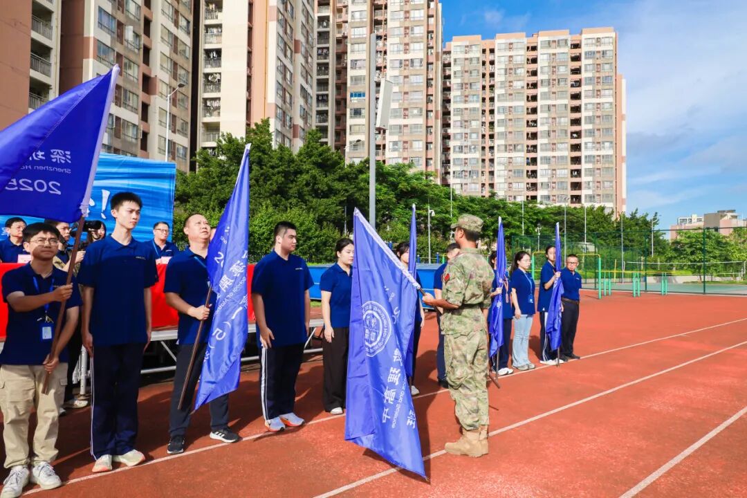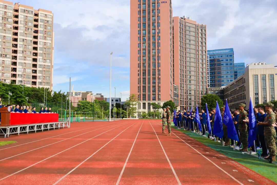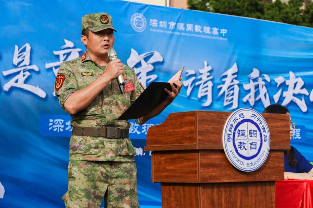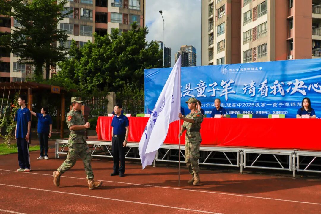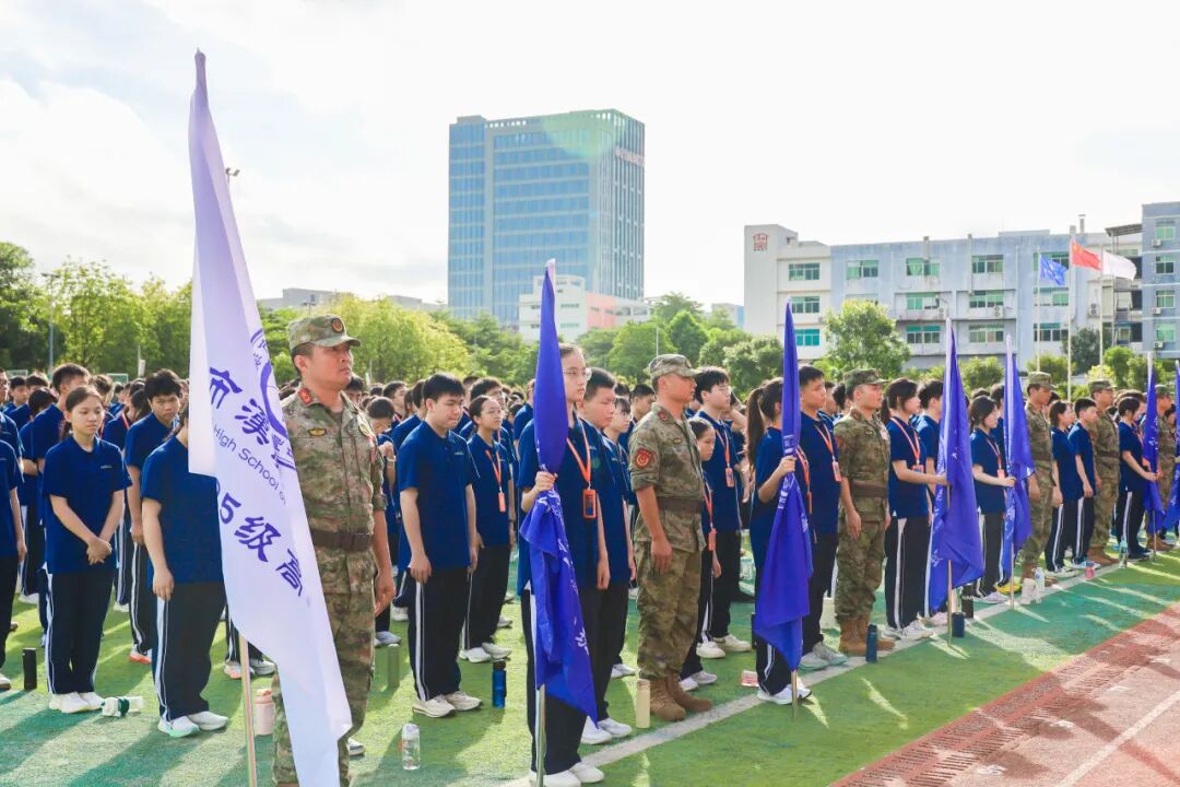 8月31日上午8时,深圳市汉开数理高中 2025级高一新生正式到校首日,校园操场旗帜飘扬——为期7天的童子军课程(军事训练)正式拉开帷幕。烈日之下,高一新生整齐列队,用“眼睛更亮、声音更响、腰杆更直、胆子更大、两臂更有力、双脚更坚定”的精气神,宣告青春与意志的第一次淬火。 开营仪式由张老师主持。学校行政领导与承担本次训练的教官团队一同出席。面对33 ℃的高温与直射的阳光,同学们始终昂首挺胸、目光坚毅,充分展现了“汉开学子”的青春活力与责任担当。