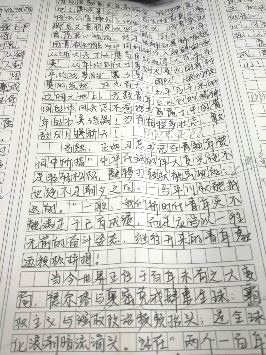 站在两个百年的交汇点上,回首望,前人遥遥招手,微笑示意;抬望眼,“问苍茫大地,谁主沉浮?”“还看今朝!”之声在耳畔彻响。希望我们青年能意识到“有我”与“无我”的重要性,扛起时代大旗,共创辉煌未来。