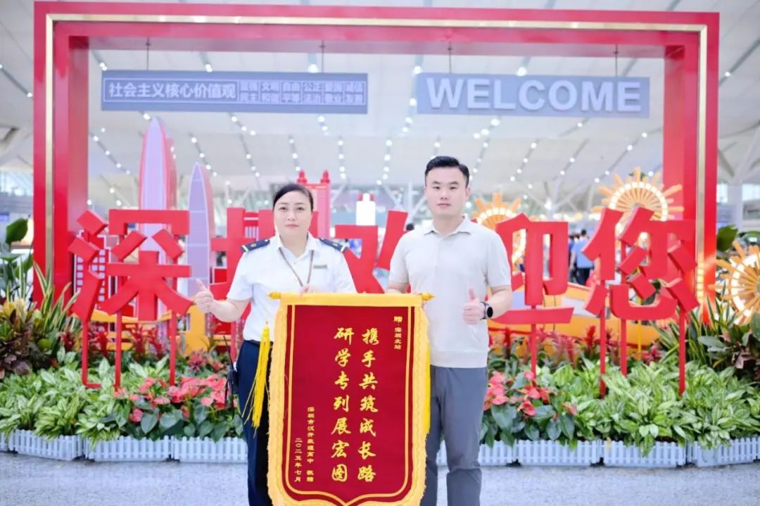 首日行程初,学务处周爽爽主任代表学校向深圳北站动车组赠送锦旗。一面锦旗,载着汉开学子的感恩,是对“成人之美”的回应,让研学首日,在礼仪传承与情谊缔结中,画上温情的符号 。